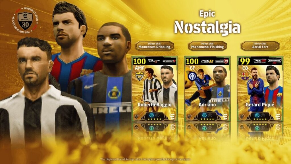 É justamente esse legado que o eFootball homenageia com a campanha Nostalgia, que traz por tempo limitado desafios com os visuais tridimensionais quadradões e simpáticos do primeiro WE. A comemoração aumenta com o retorno de atletas consagrados que fizeram a fama da franquia no passado e que você pode contratar para seu time virtual, como o italiano Roberto Baggio (aquele do pênalti da Copa de 1994) e o craque Adriano Imperador.